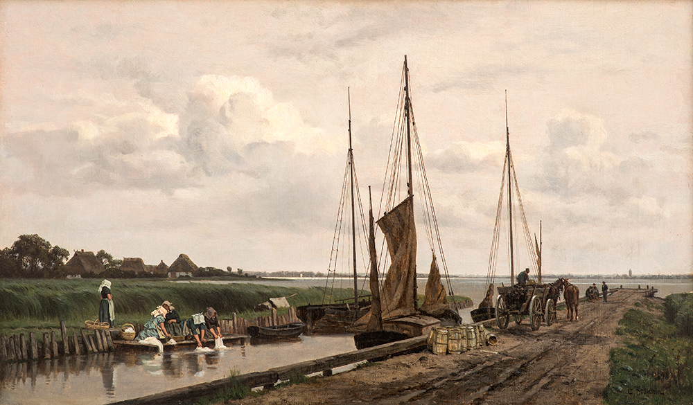 Ausschnitt Wolkenhimmel aus: Carl Malchin (1838-1923) „Bootsplatz am Bodden“, um 1900, Öl auf Malkarton, 30 x 41 cm, Sammlung Kunstmuseum Ahrenshoop
