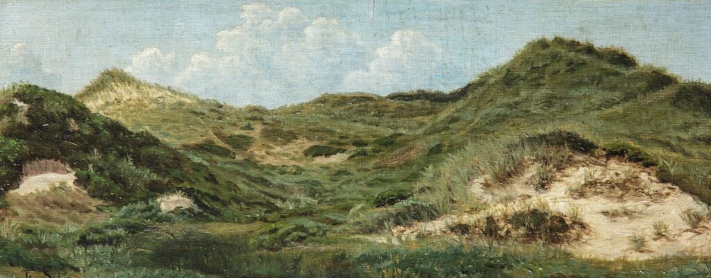 Ausschnitt Düne aus: Paul Müller-Kaempff (1861-1941) „netzboot auf blühender Düne“, um 1893, Öl auf Leinwand, 50 x 80 cm, Sammlung der Gemeinde Ahrenshoop/Förderkreis Ahrenshoop e.V.