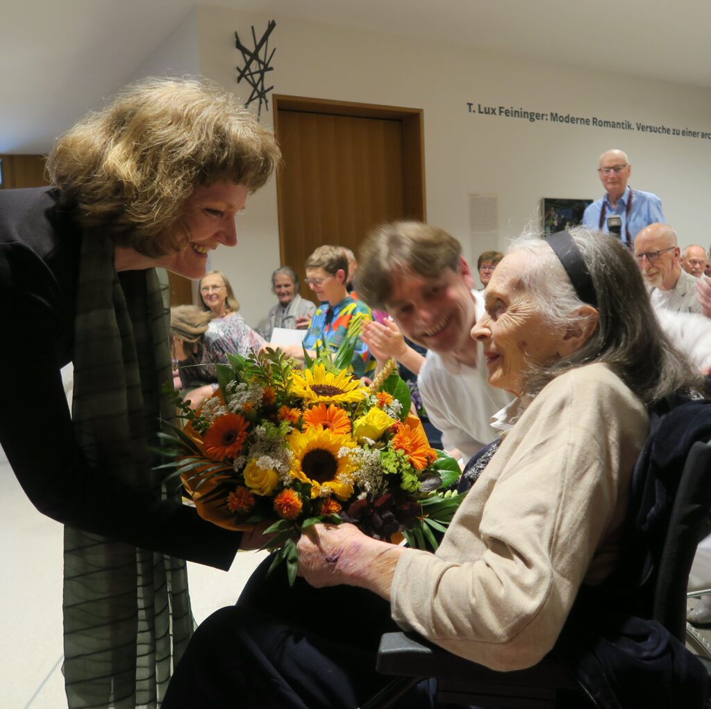 „Genießen wir die Ausstellung in ihrer kostbaren Gegenwart“, sagte Kunstwissenschaftlerin Dr. Katrin Arrieta am Abend des 11. Juli 2025 im übervollen Kunstmuseum zu Ahrenshoop. Ruth Klatte war anwesend. Die Fotoapparate blitzten, die Smartphone leuchteten auf, Blumensträuße gingen von Hand zu Hand. Die Künstlerin konnte es kaum fassen, was ihr widerfuhr. Sie saß und staunte mit großen Augen.